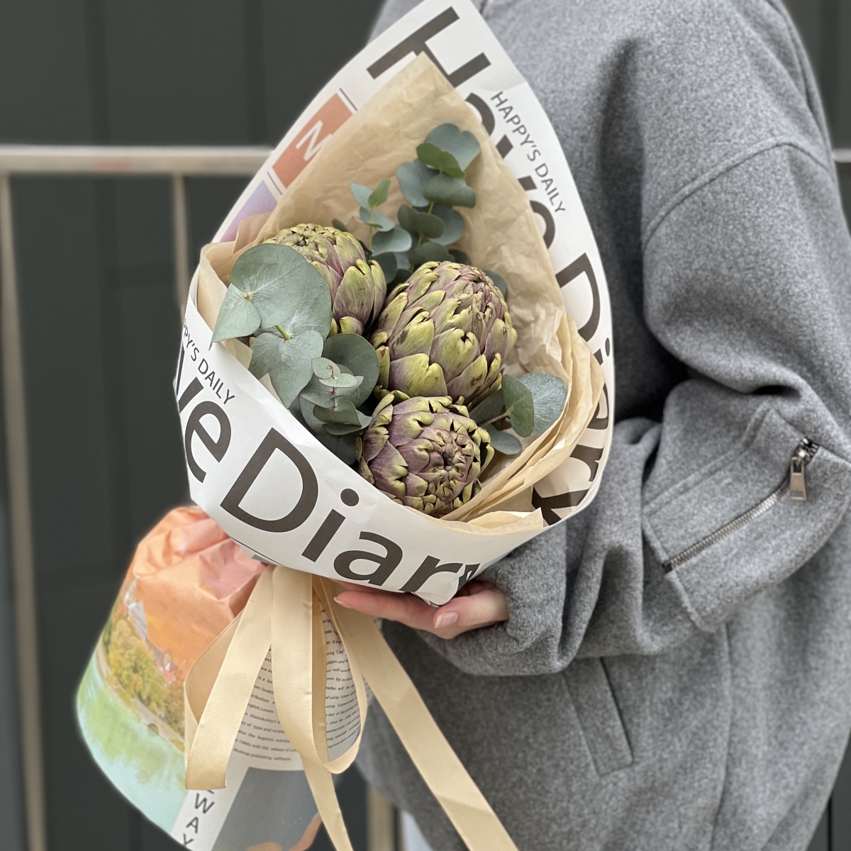 Артишок — выбор для тех, кто ценит оригинальность, стиль и современность. Такая композиция точно привлечёт внимание, подчеркнёт вкус дарителя и станет эффектным подарком для любого события.