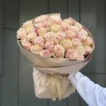 Букет Маруан из кустовых пионовидных роз сильвия пинк, эустомы, гвоздики и эвкалипта